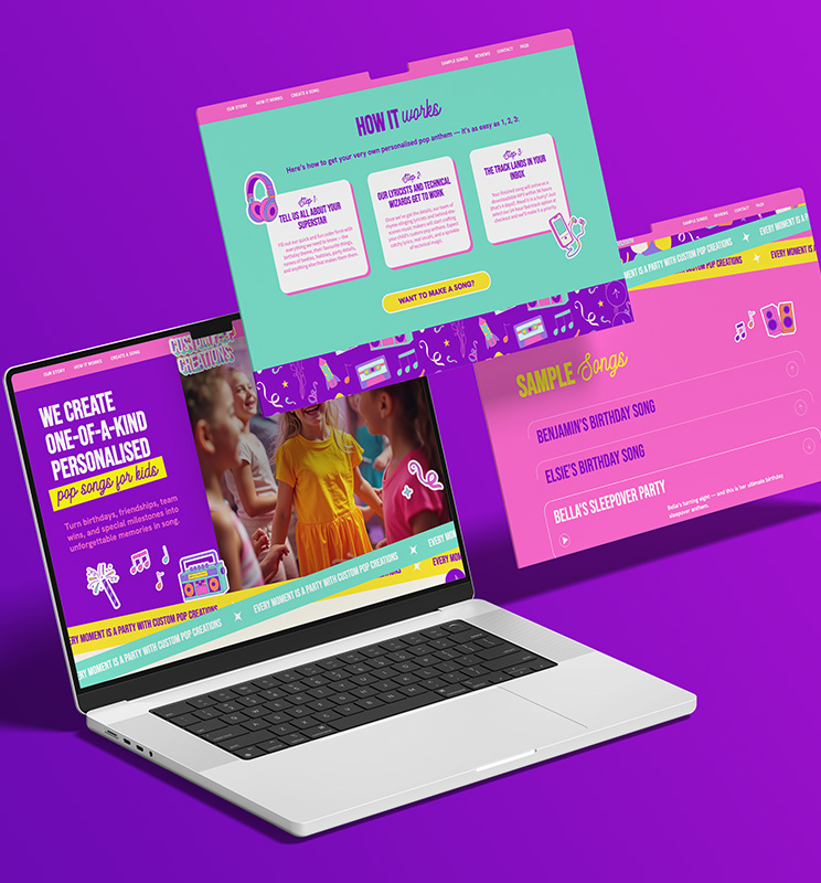 A vibrant website for Custom Pop Creations that showcases the innovative bespoke personalised birthday messages. The site combines eye-catching visuals with straightforward navigation to drive sales and engagement.